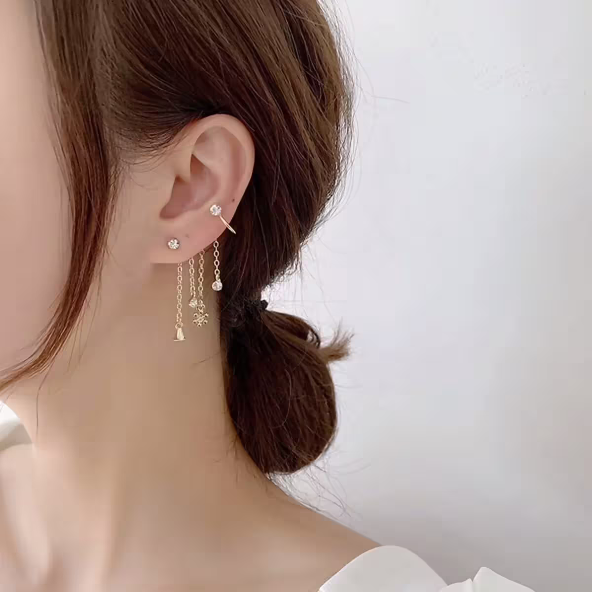 ▶名稱/雪花鈴鐺流蘇耳掛×不對稱後掛式吊墜耳環
