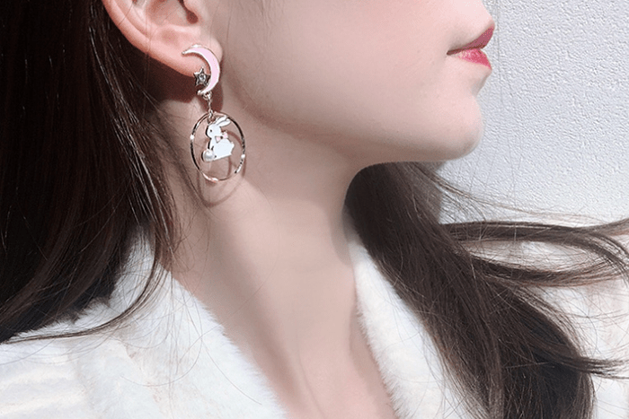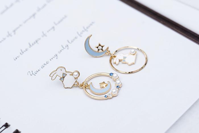 ▶名稱/小兔彎月星空圓環×不對稱吊墜耳環×共二色