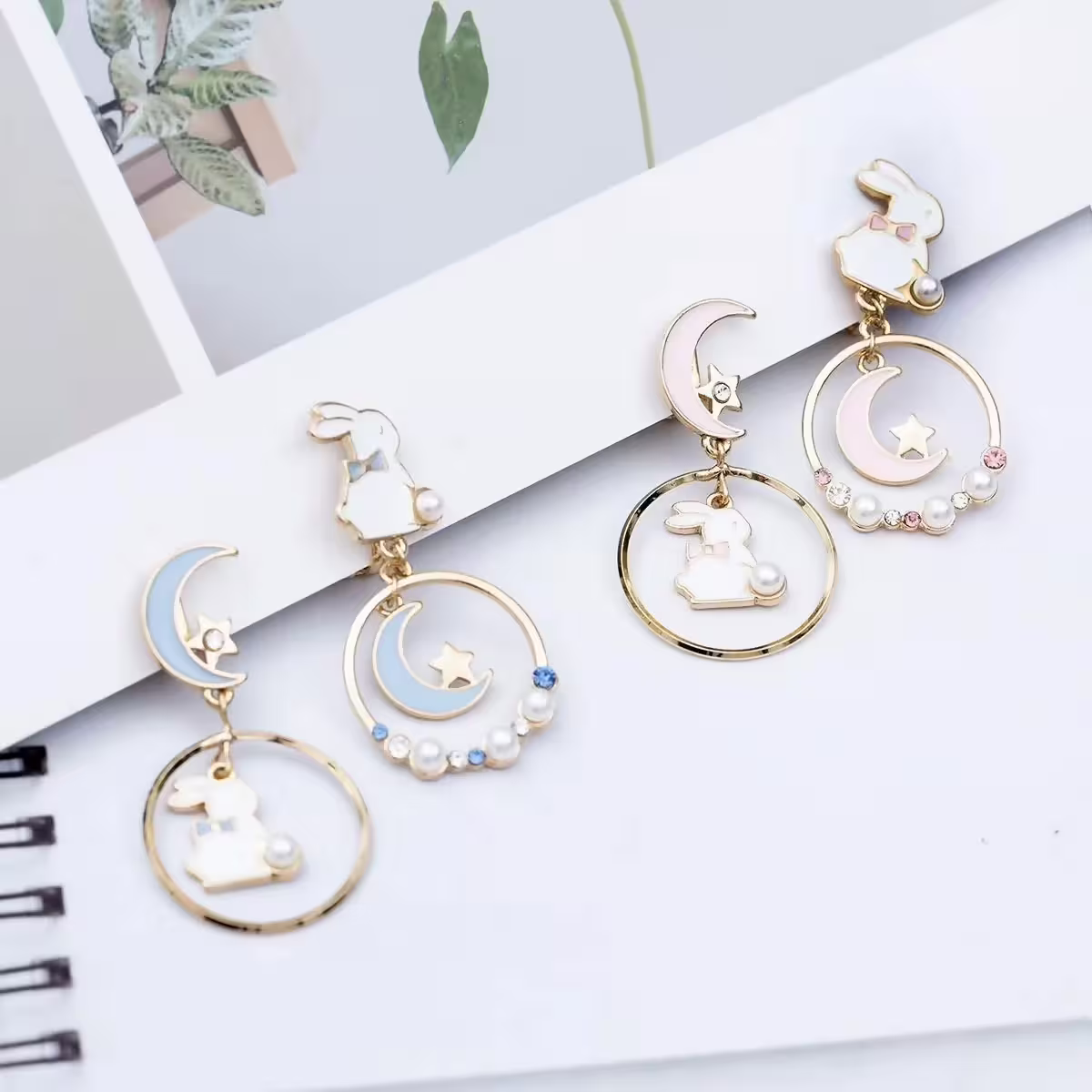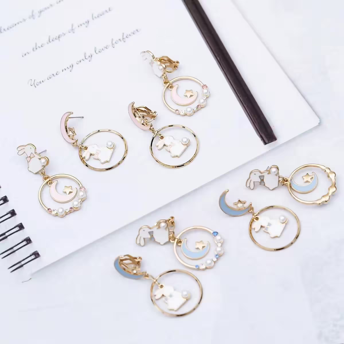 ▶名稱/小兔彎月星空圓環×不對稱三角耳夾×共二色