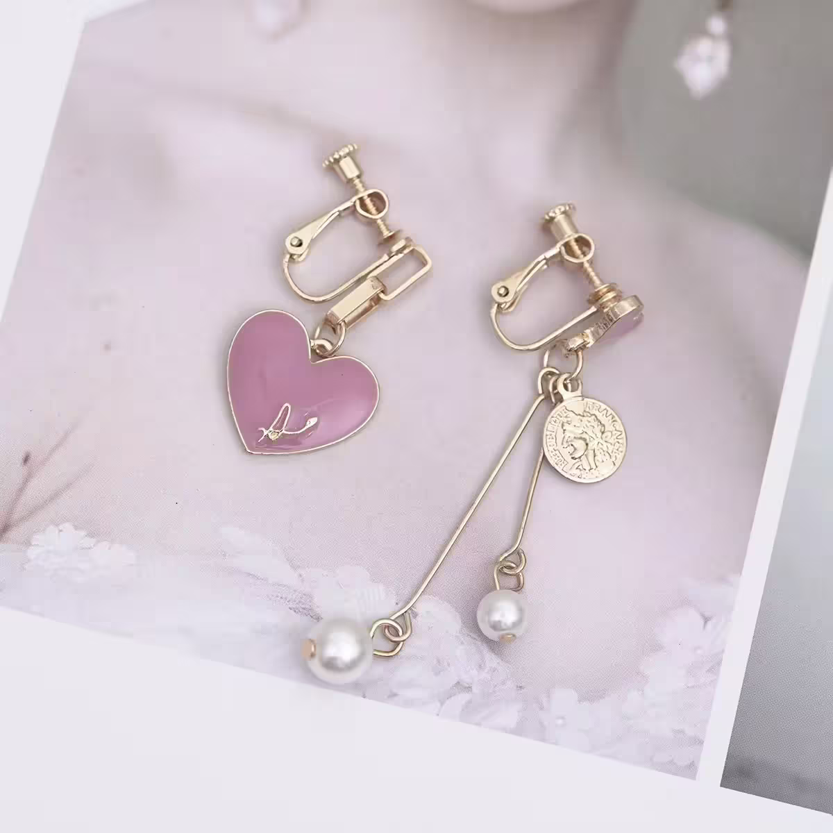 ▶名稱/粉紅愛心希臘古幣×不對稱螺旋耳夾