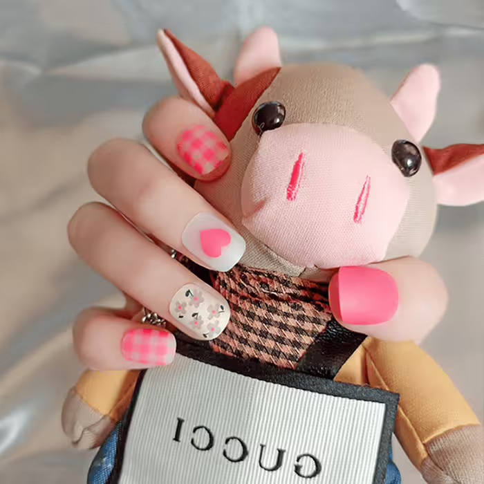 ▶名稱/粉桃格子小花霧面×穿戴式手指甲片×二十四入