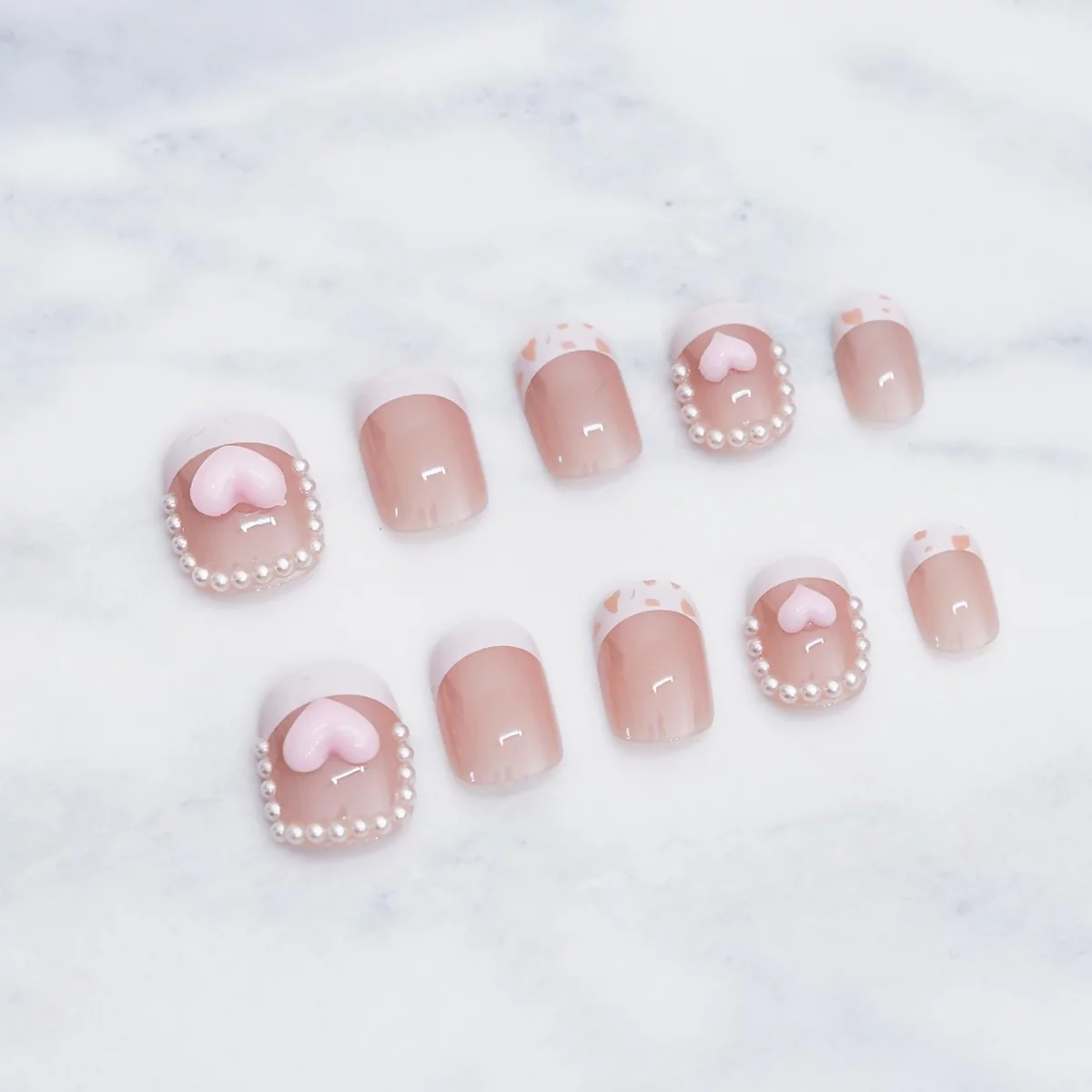 珍珠圍繞愛心粉色亮面×穿戴式手指甲片×二十四入