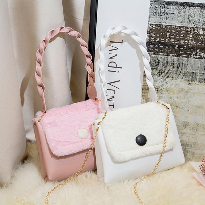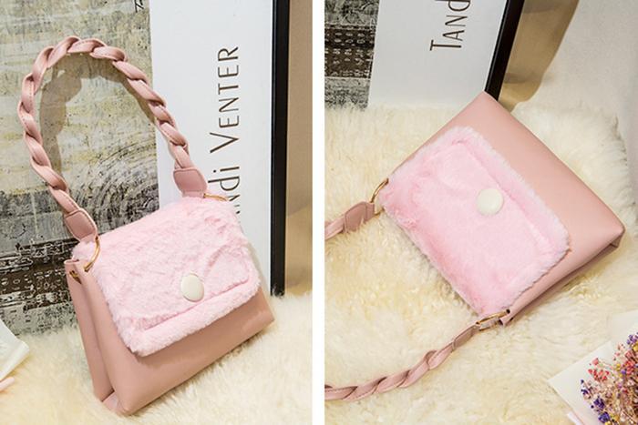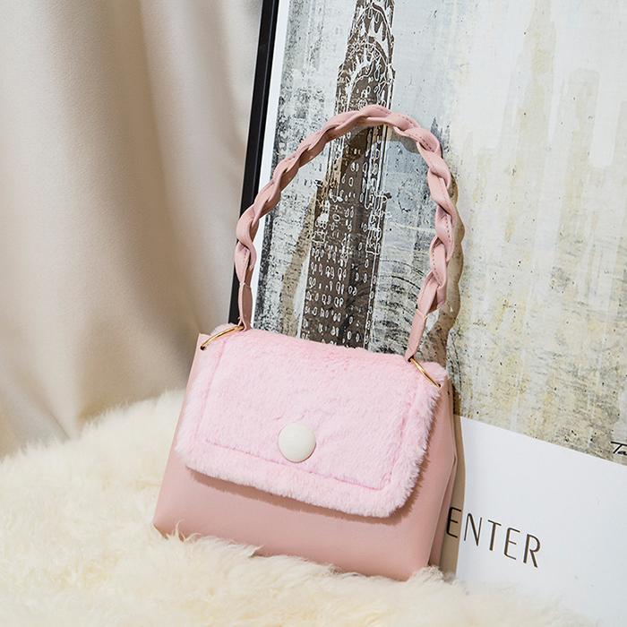 ▶名稱/絨毛翻蓋皮革×金屬鍊條麻花紐結背帶×斜背包×粉紅